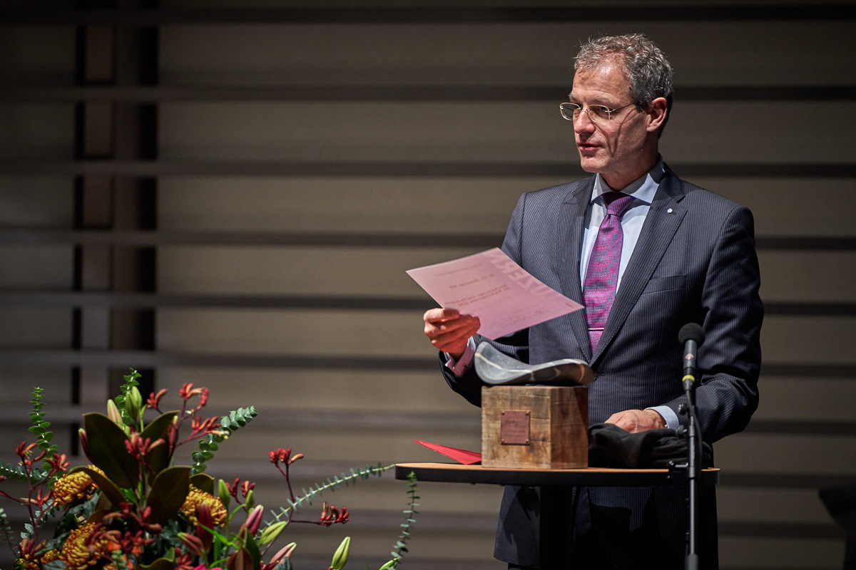 Regierungspräsident Reto Wyss übergibt die Urkunde und den Anerkennungspreis (Kunstobjekt von Saskya Germann)