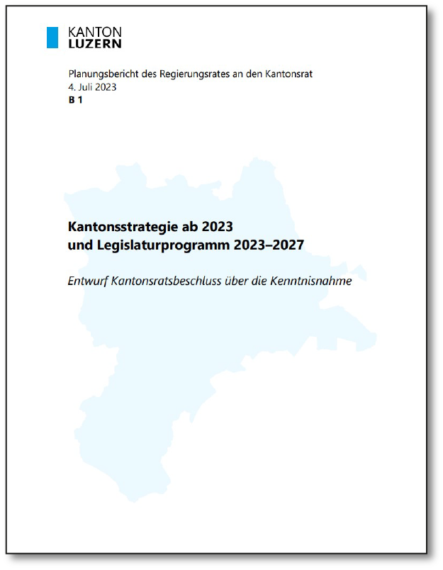 Der Regierungsrat hat die Herausforderungen und den Handlungsbedarf für die Legislaturperiode 2023–2027 beurteilt. Er hat fünf übergeordnete Entwicklungen identifiziert, die den Kanton Luzern stark prägen werden: die Globalisierung, die Ökologisierung, die Digitalisierung, den gesellschaftlichen Wandel und die Urbanisierung. Wie sich der Kanton zu diesen Entwicklungen verhalten will und wie das politische Handeln konkret aussehen soll, legt der Regierungsrat mit Hilfe von fünf Schwerpunkten und fünf Leitsätzen in der Kantonsstrategie und mit 34 Legislaturzielen im Legislaturprogramm dar.