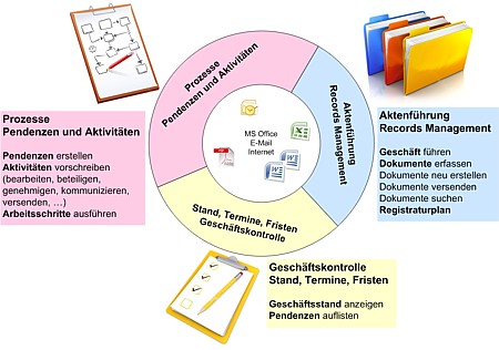 Das Einsatzgebiet Geschäftsverwaltung (GEVER) betrifft den Einsatz von EDV-Mitteln für die dokumentengestützte Geschäftsbearbeitung. GEVER stellt Funktionen bereit für das Records Management (Aktenführung, inklusive Document Management), die Geschäftkontrolle (Erstellen, Zuteilen und Nachverfolgen von Pendenzen, Fristen Terminen) sowie für den Workflow (Prozessführung durch Zuweisen und Bearbeiten von Aktivitäten).